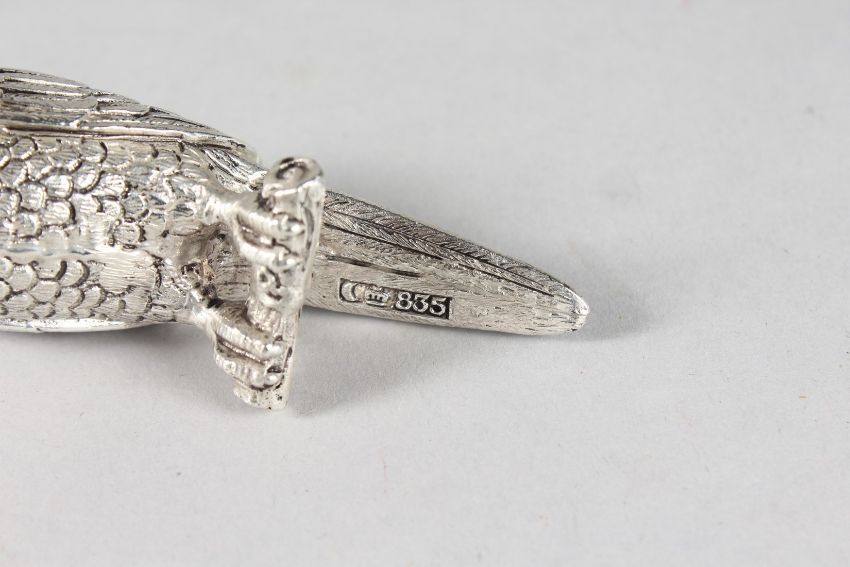 A SILVER PLATED PARROT SCENT BOTTLE with a ruby collar.