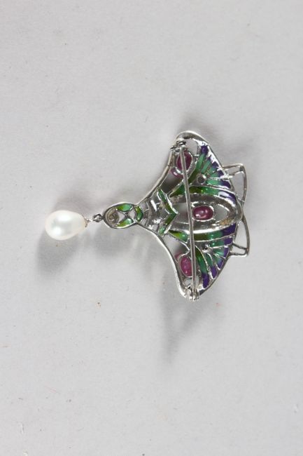 A SILVER RUBY, PEARL AND PLIQUE ENAMEL BROOCH.
