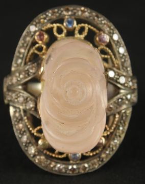 A LARGE AND IMPRESSIVE SILVER GILT RING set with a large carved rose quartz and coloured diamonds, boxed.