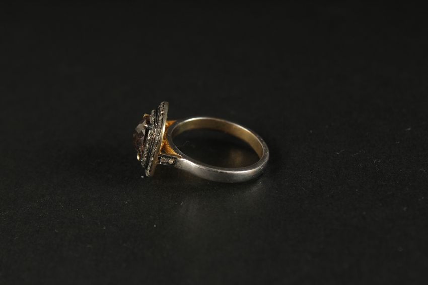 A SILVER GILT DRESS RING set with a central fancy brown rose-cut cushion-shaped diamond and two halos of rose-cut diamonds.
