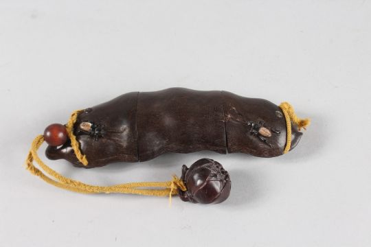 A JAPANESE CARVED WOOD FRUIT INRO with spiders on a rope.