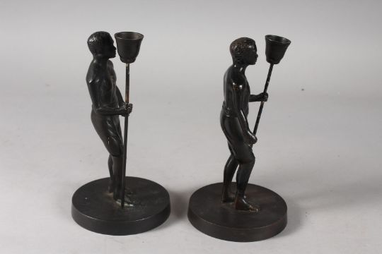A PAIR OF BRONZE NUBIAN FIGURAL CANDLESTICKS on circular bases.