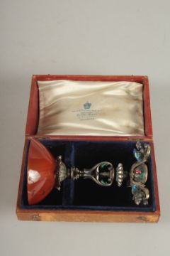 A GOOD AGATE 19TH CENTURY SILVER and ENAMEL CUP 2.5ins. Cup repaired on a very good quality stand by MACKAY CUNNINGHAM & CO, EDINBURGH, in original leather box.