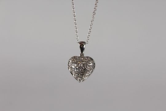 AN 18CT WHITE GOLD AND DIAMOND HEART SHAPED PENDANT AND FINE CHAIN, 0.75CT.