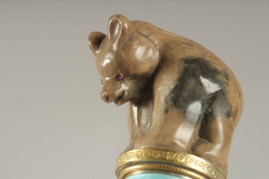A VERY GOOD RUSSIAN SILVER AND ENAMEL HARDSTONE BEAR CANE TOP.