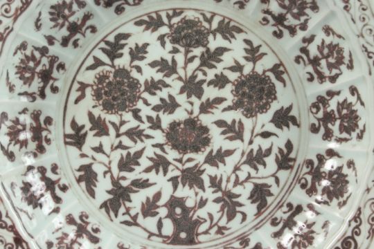 A LARGE CHINESE UNDERGLAZE RED AND WHITE PORCELAIN PETAL-RIM DISH, with decorative floral motifs, 41.5cm wide.