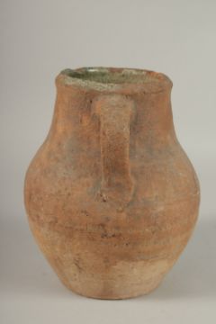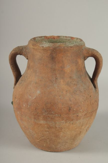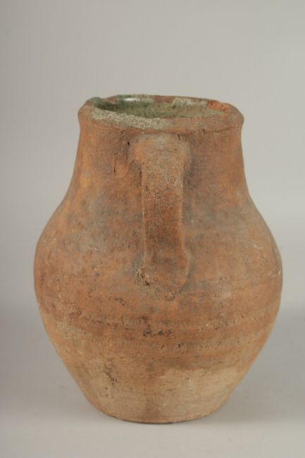 A 10TH CENTURY MIDDLE EASTERN UNGLAZED POTTERY TWIN HANDLE JUG, the interior with traces of green glaze, 22.5cm high.