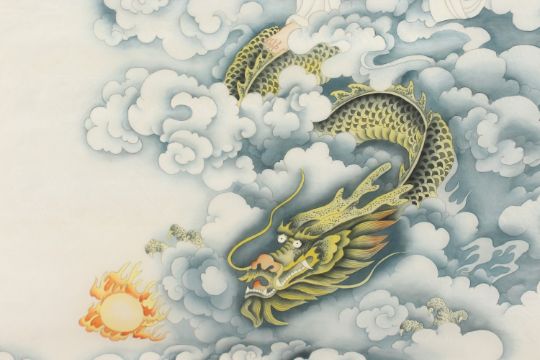 A LARGE CHINESE PAINTING ON SILK, depicting Guanyin stood upon a dragon chasing the flaming pearl of wisdom, inscribed and bearing red seal mark, 117cm x 72cm.