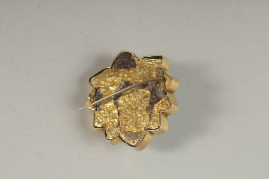 A FINE 17TH-18TH CENTURY TIBETAN TURQUOISE INSET GOLD MOUNTED BROOCH.