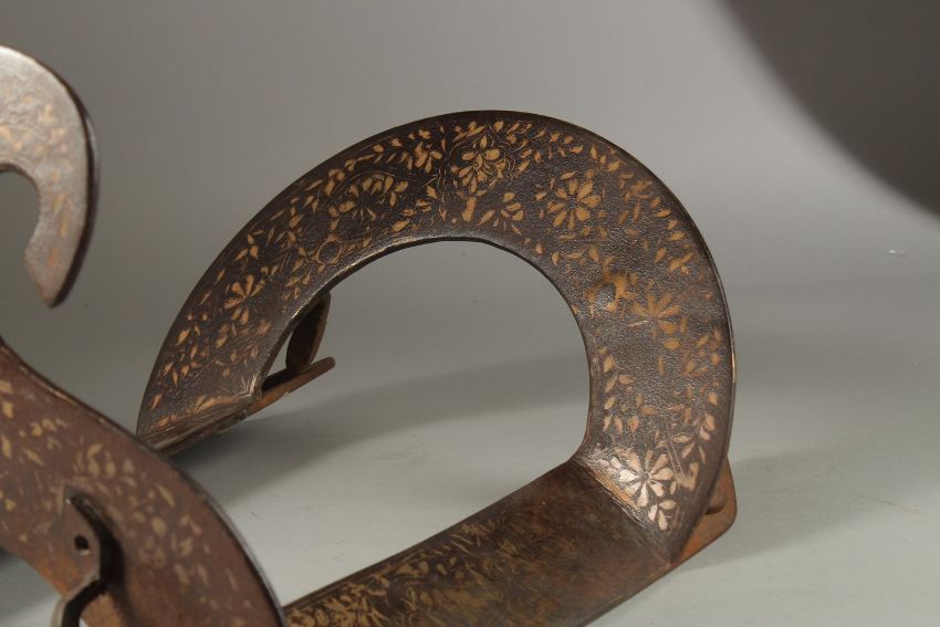 A RARE AND FINE 18TH-19TH CENTURY PERSIAN SILVER INLAID IRON SADDLE, with calligraphic inscriptions, 39cm long.