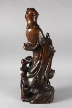 A 19TH CENTURY CHINESE CARVED ROOTWOOD GUANYIN FIGURE, stood upon a dragon-like beast with inset eyes, 46cm high.