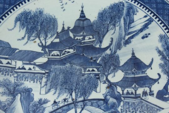 A LARGE 19TH CENTURY CHINESE BLUE AND WHITE PORCELAIN CHARGER, painted with a landscape scene illustrating figures on horseback crossing a bridge approaching a temple, 47cm diameter.