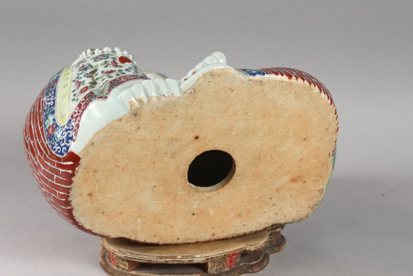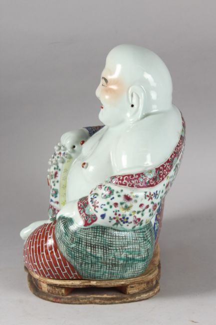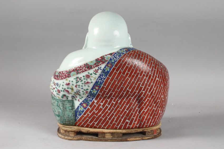 A LARGE CHINESE PORCELAIN LAUGHING BUDDHA, on a shaped stand, the robes painted with flowers and brickwork type pattern, impressed mark to base, 28cm high.