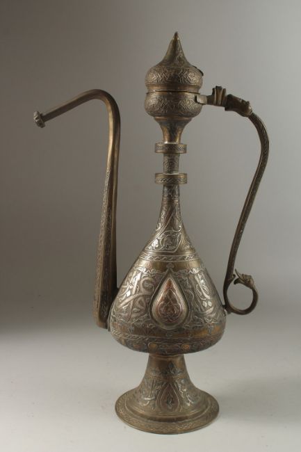 A VERY FINE AND LARGE 19TH CENTURY SYRIAN DAMASCUS SILVER AND COPPER INLAID BRASS EWER, with calligraphic decoration, 50cm high.