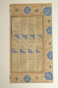 A 17TH CENTURY SAFAVID IRAN GOLD CALLIGRAPHIC PANEL FROM THE BOOK OF SHAHNAMA, with blue illumination, prov. Christies South Kensington.
