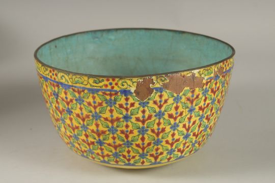 A VERY FINE 19TH CENTURY THAI ENAMELLED COPPER BOWL, 21cm diameter.