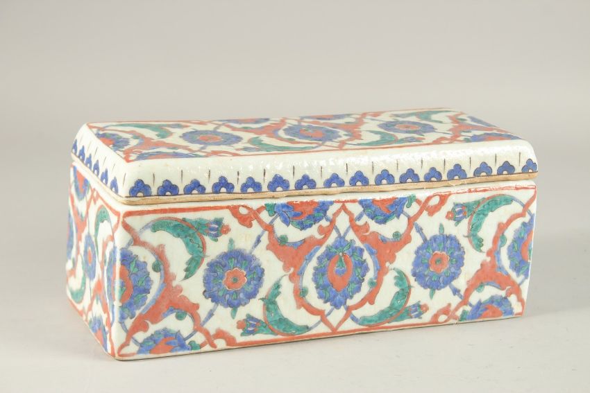 A TURKISH IZNIK GLAZED POTTERY RECTANGLAR LIDDED BOX, 28cm long.