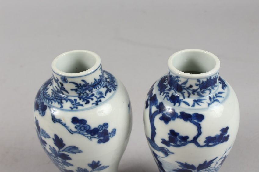 A PAIR OF CHINESE BLUE AND WHITE PORCELAIN VASES, painted with birds, trees, and flora, 18cm high.
