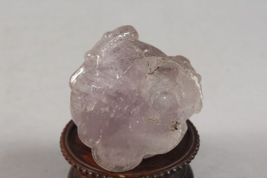 A CHINESE CARVED ROSE QUARTZ TOAD ON HARDWOOD STAND, rose quartz 6.5cm high, 7cm long.