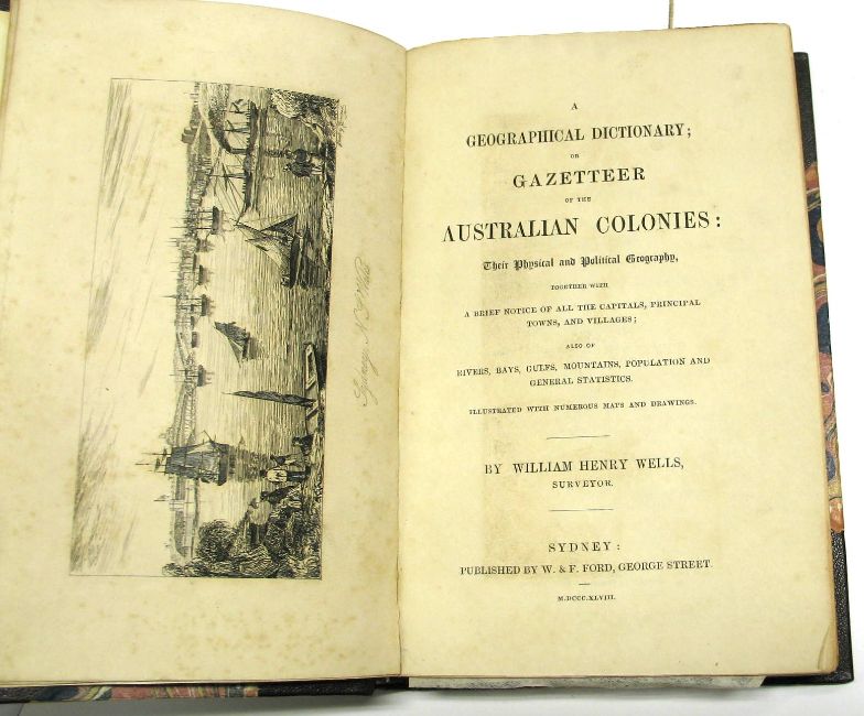 [AUSTRALIA MAPS etc.] WELLS (William Henry) A Geographical Dictionary; or Gazetteer of the Australian Colonies: 8vo, pp. xv (i), 438, 1 f. (blank), pp. 15 (1) adverts, 4 plates (some foxing), folding map and 22 hand -col'd single-page maps, 20th c. brown half-morocco, Sydney, W & F. Ford, 1848 and another, later book, author signed (2).