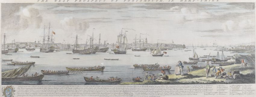 'The West Prospect of Portsmouth in Hampshire', later hand coloured engraving,