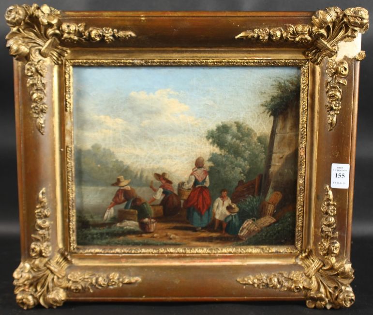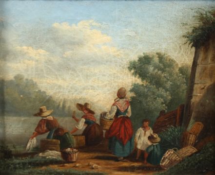 Female figures washing clothes, oil on canvas,