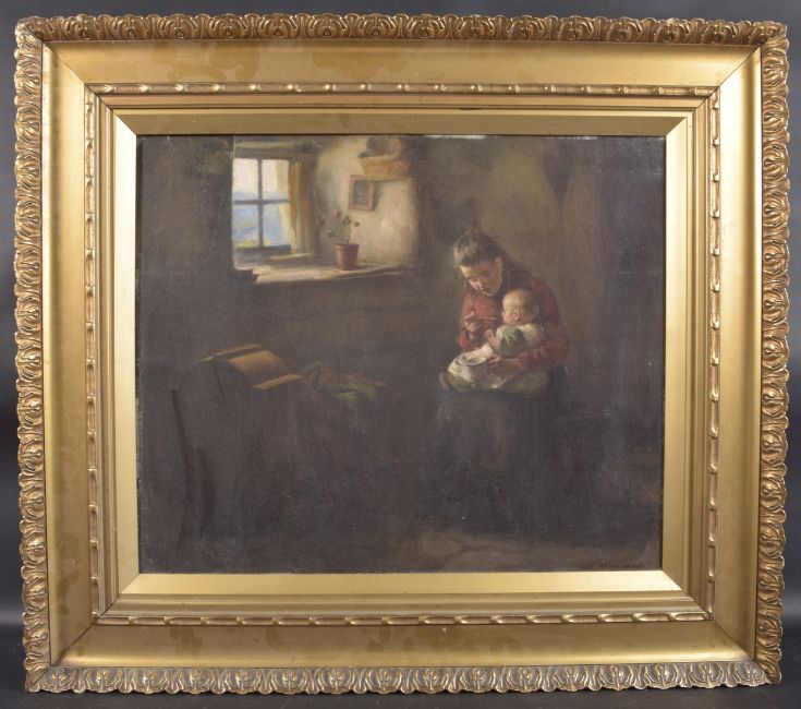 Interior scene of a young woman feeding a child by a window,