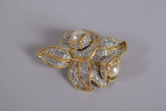 A GILT METAL AND DIAMONTE FLOWER BROOCH