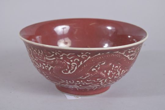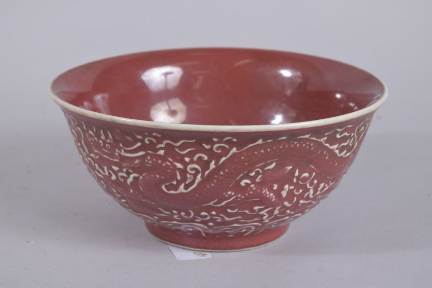 A CHINESE COPPER RED DRAGON AND PHOENIX BOWL.