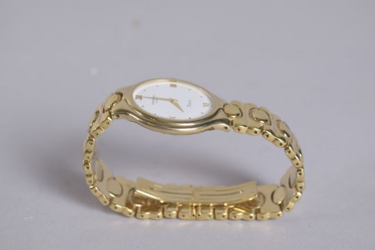 A RAYMOND WEIL TOSCA WRIST WATCH with gilt metal bracelet.