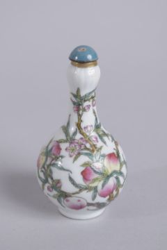 A 20TH CENTURY CHINESE FAMILLE ROSE PORCELAIN SNUFF BOTTLE, with peaches and bats, base with character mark, 8cm high.
