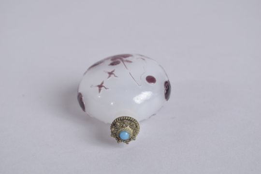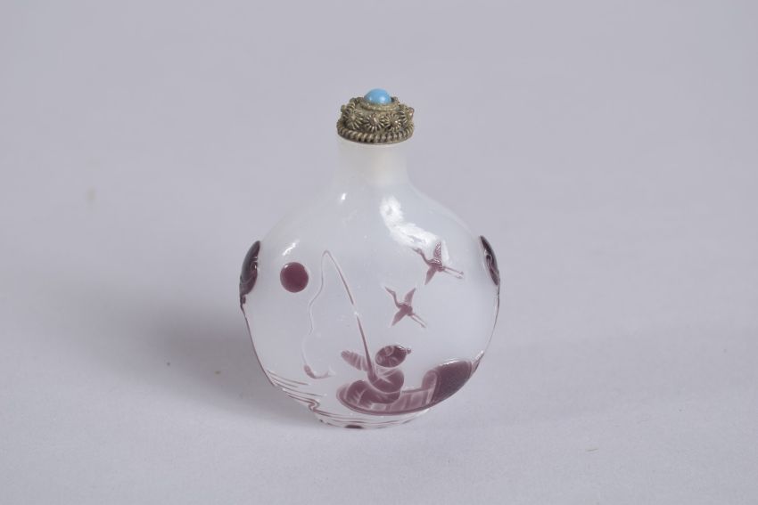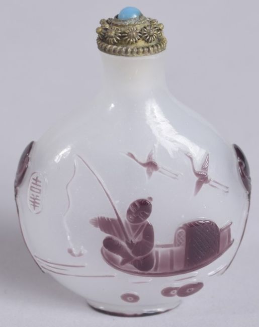 AN EARLY 20TH CENTURY CHINESE PEKING GLASS SNUFF BOTTLE, decorated with fisherman and flying cranes, 6.5cm high.