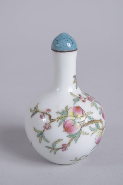 A 20TH CENTURY CHINESE FAMILLE ROSE PORCELAIN SNUFF BOTTLE, painted with peaches, character mark to base, 7.5cm high.