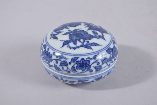 A CHINESE BLUE AND WHITE PORCELAIN CIRCULAR INK BOX, painted with peaches, bearing six-character Yongzheng mark, 7cm diameter.