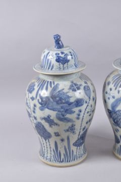 A LARGE PAIR OF CHINESE BLUE AND WHITE PORCELAIN JARS AND COVERS, painted with fish and aquatic flora, 53cm high.