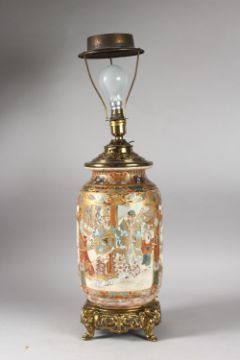 A 19TH CENTURY JAPANESE SATSUMA VASE TABLE LAMP, with gilt metal mounts and stand, raised on four elephant form feet, 62cm high overall.