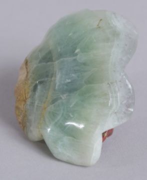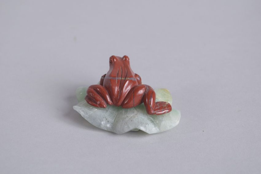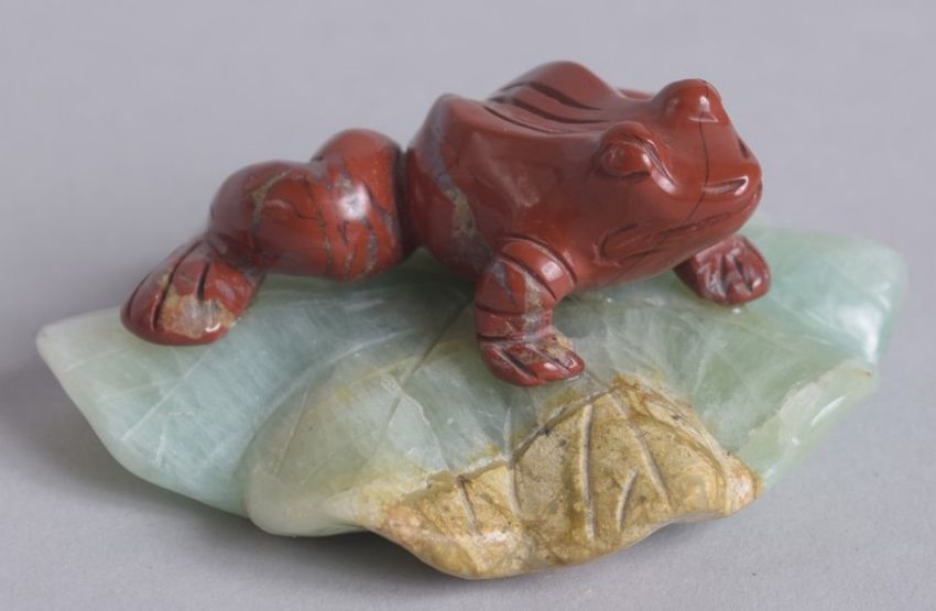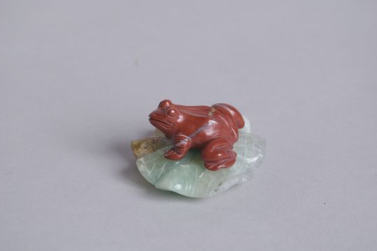 AN EARLY 20TH CENTURY CHINESE CARVED RED AGATE FROG ON A GREEN QUARTZ LILY PAD, 7cm wide.