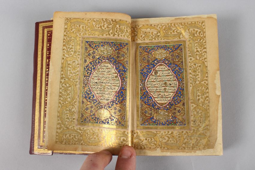 A VERY FINE SMALL OTTOMAN TURKISH LEATHER BOUND QURAN, with exceptional gilded and illuminated pages, copied by 'Umar al-Zuhdi', dated 1264 AH / 1847 AD, 14cm x 10cm. Provenance: Sotheby's 19.10.2016, lot 178.
