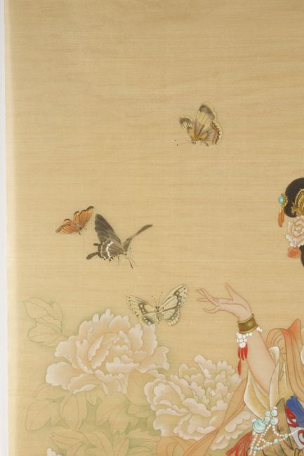 A LARGE CHINESE PAINTING ON SILK, depicting two female figures amongst flora and butterflies, inscribed and bearing red seal mark, 117cm x 52cm.