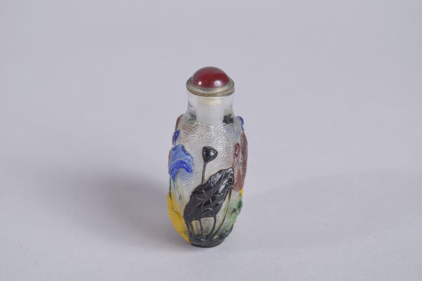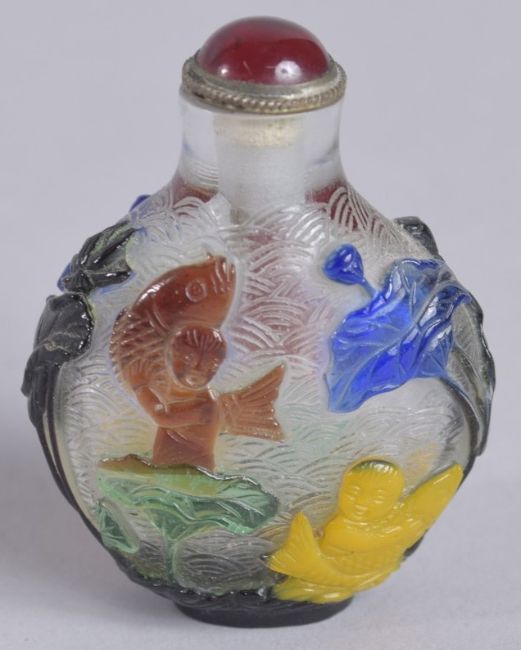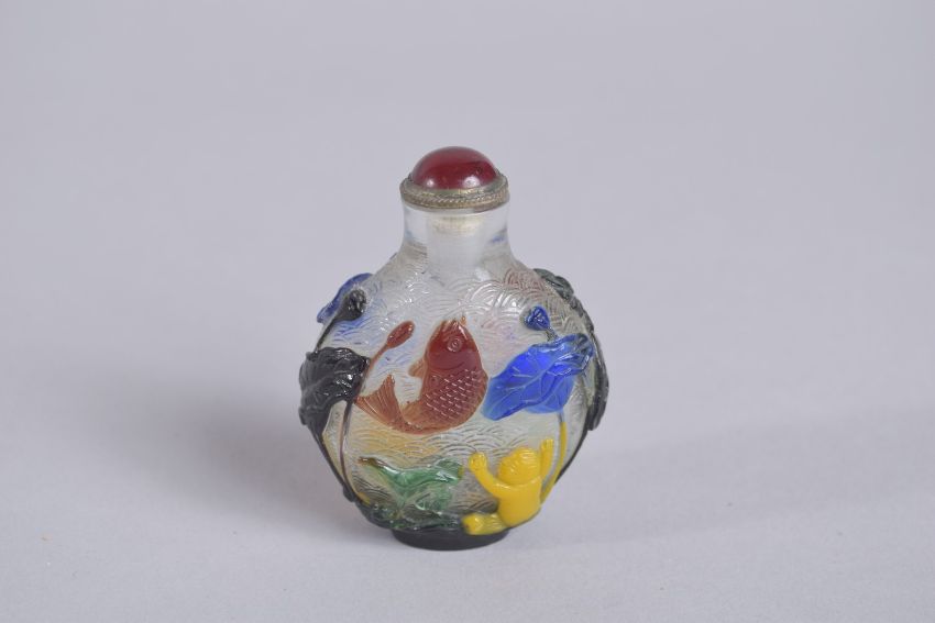 A 19TH CENTURY CHINESE FIVE-COLOUR PEKING GLASS SNUFF BOTTLE, decorated with boys, fish, and lotus leaves, 6cm high.