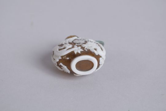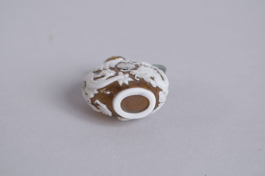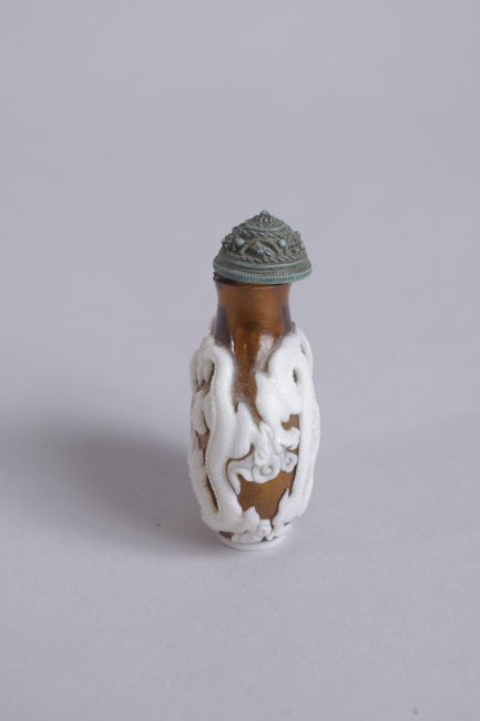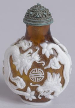 AN EARLY 20TH CENTURY CHINESE PEKING GLASS SNUFF BOTTLE, decorated with dragons and longevity symbol, 6cm high.
