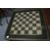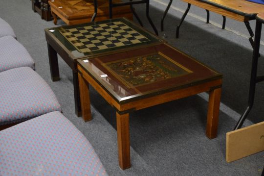 Two brass bound glass top coffee tables, one with medieval style decoration depicting figures and the other a chess board design.
