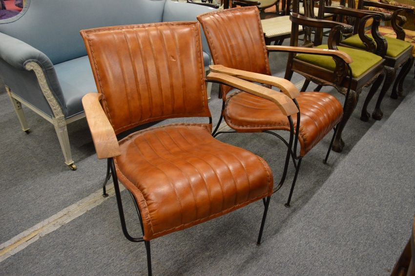 A stylish pair of leather upholstered armchairs with wrought iron frames.
