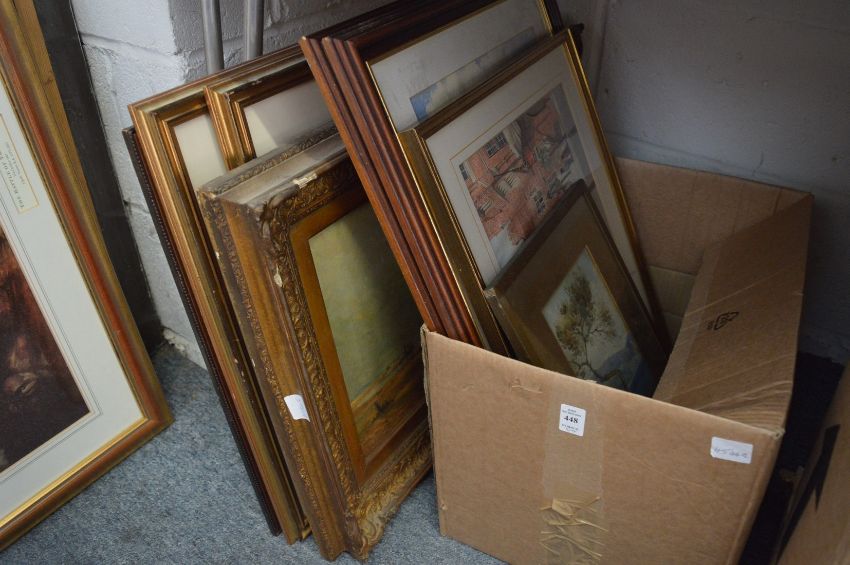 Various paintings and prints to include coastal landscape with beached fishing boats, oil on canvas.