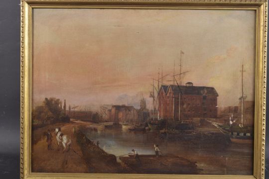 View of a riverside wharf with chain ferry and moored boats, possibly Gloucester Docks,