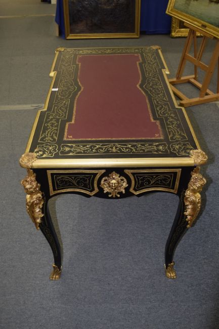 A GOOD BOULLE BUREAU PLAT with leather top, three frieze drawers, ormolu mounts and masks, on curving legs.