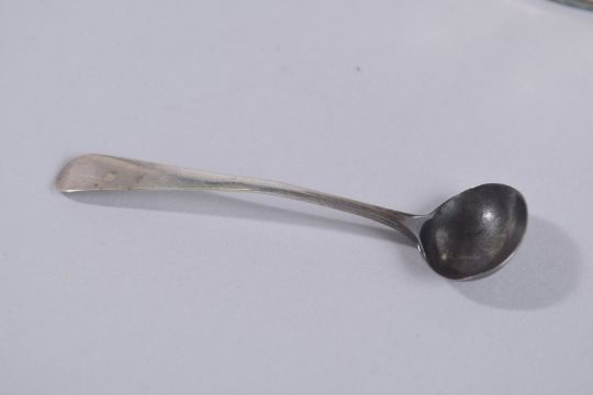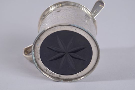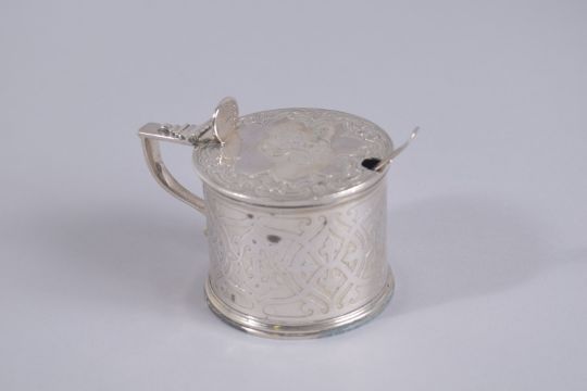 A VICTORIAN SILVER ENGRAVED DRUM MUSTARD POT AND SPOON with sapphire blue liner.
