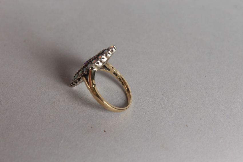 A 9CT GOLD, AMETHYST AND OPAL MARQUISE SET RING.