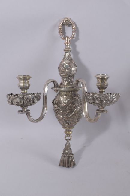 A GOOD PAIR OF OLD SHEFFIELD PLATE TWO-BRANCH WALL LIGHTS with ribbon motifs.