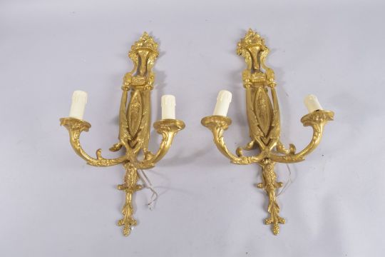 A GOOD PAIR OF GILT BRONZE TWO-LIGHT WALL SCONCES.